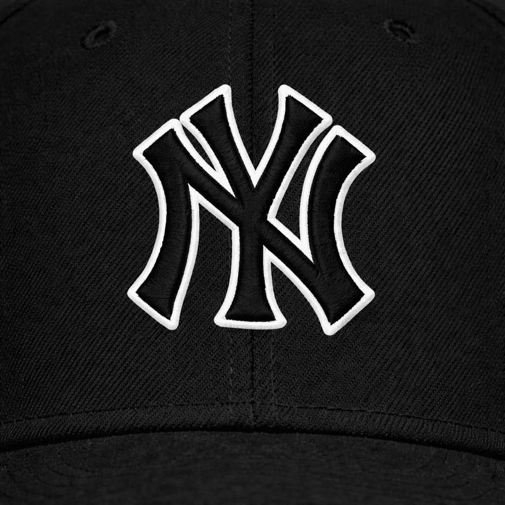 Casquette noire avec logo NY brodé en noir et contour blanc, offrant un rendu sobre, net et puissant. La broderie frontale est propre et précise, avec un contraste maîtrisé qui met en valeur le relief du logo sans effet brillant excessif.