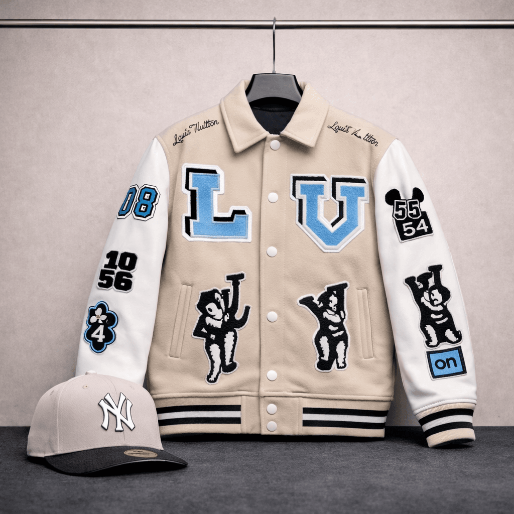 Le blouson varsity LV Heritage se distingue par son corps en laine beige premium et ses manches contrastées effet cuir crème.