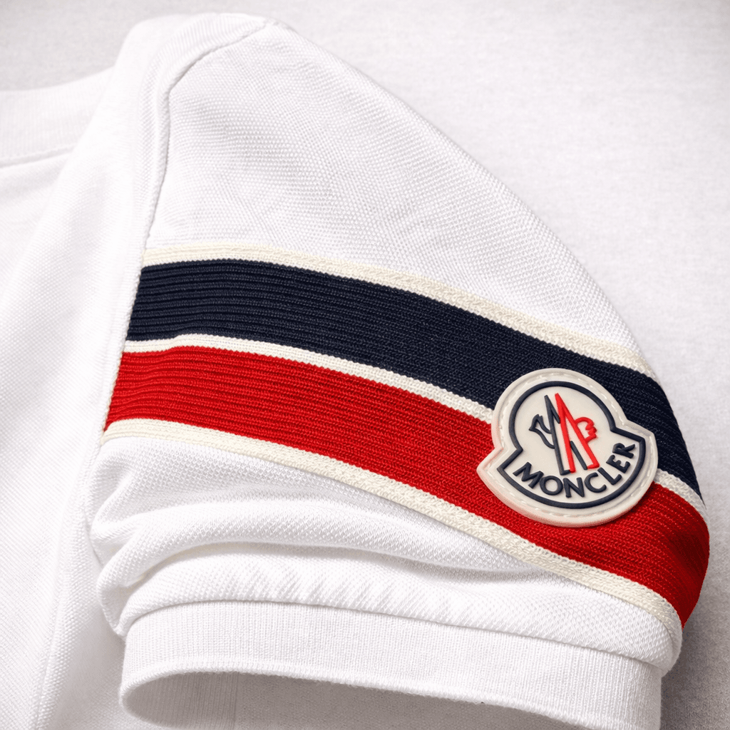 Polo blanc au style premium, avec manche ornée de bandes tricolores texturées bleu marine, rouge et blanc. Le patch Moncler appliqué sur la manche renforce son identité visuelle et son allure haut de gamme. La maille piquée apporte du relief au tissu, tandis que les finitions propres donnent un rendu chic, moderne et soigné. Un modèle fort, élégant et distinctif, idéal pour un look casual luxe.