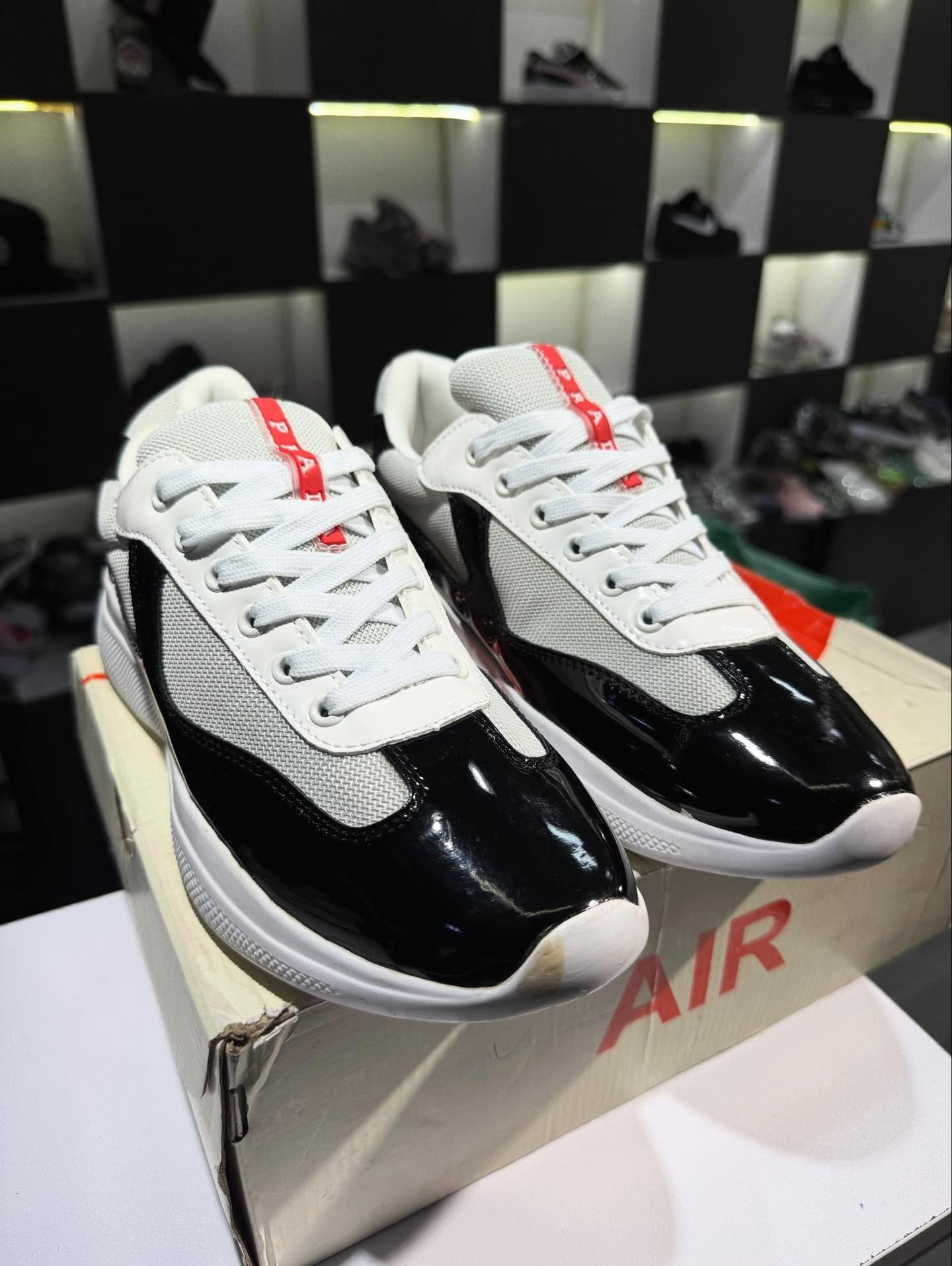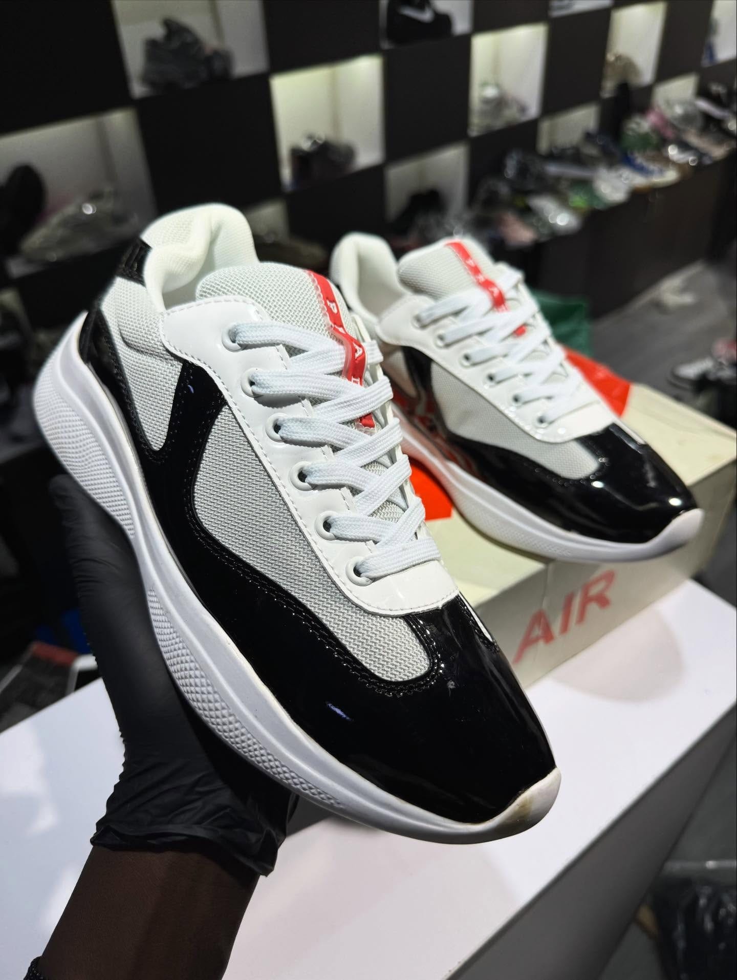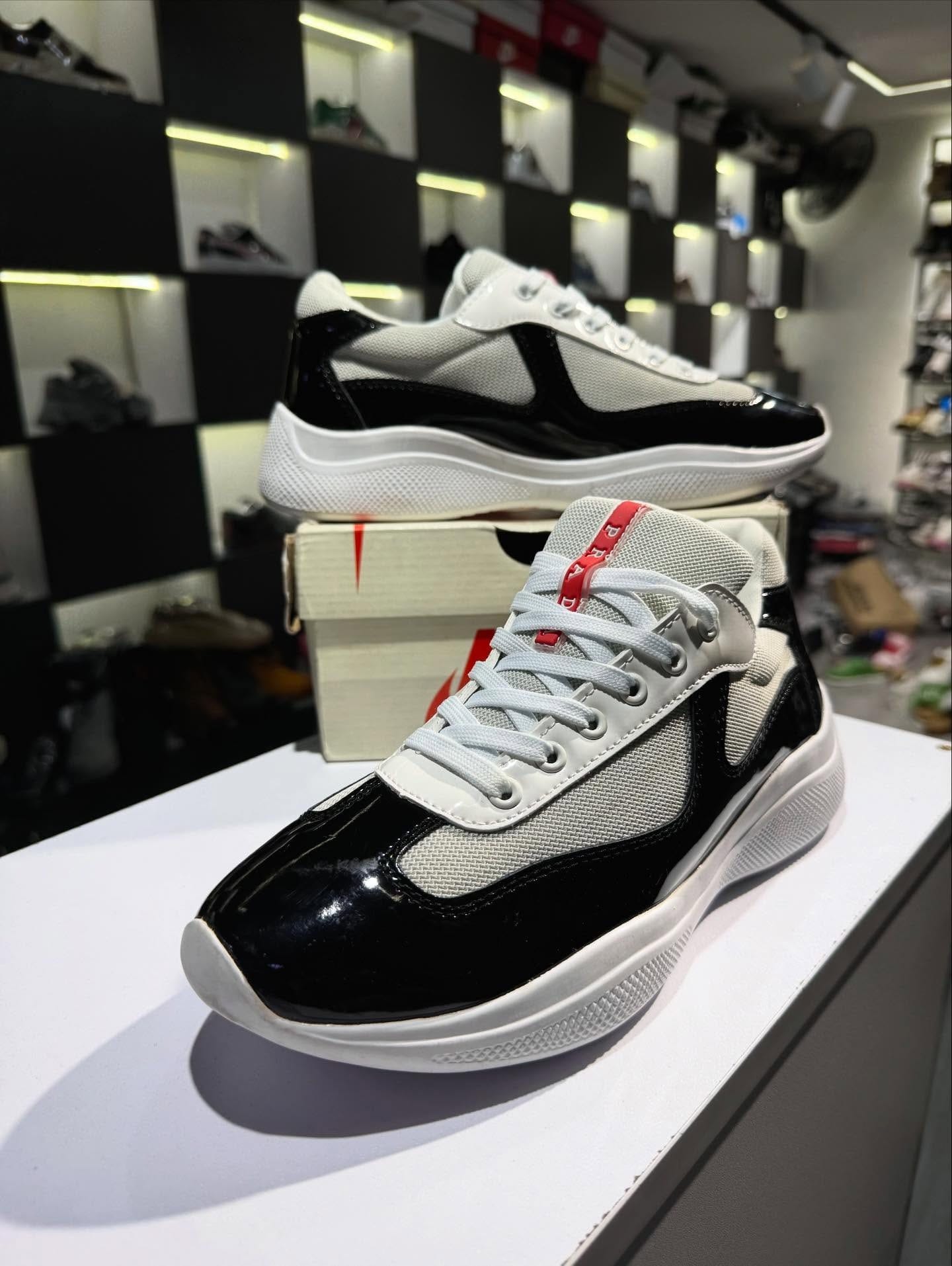 Sneakers au design moderne et élégant, combinant finitions brillantes noires et textile respirant gris clair. Leur semelle épaisse assure un confort optimal au quotidien, tandis que les détails soignés apportent une touche premium parfaite pour un look urbain chic. Idéales pour un style casual sophistiqué ou streetwear propre.